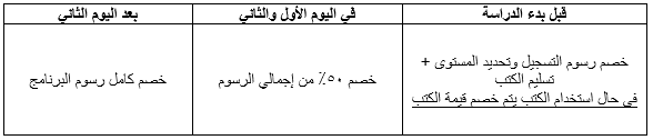 - التحويل إلى برنامج آخر : يسمح التحويل من بدء البرنامج على أن يتم خصم الأيام من إجمالي الرسوم المدفوعة وعلى المتدربة دفع الفرق بين البرنامجين .- التحويل إلى شخص آخر : يسمح بتحويل المبلغ المدفوع إلى قريب أو صديق شريطة عدم بدء البرنامج وفي حال وجود فرق يتم دفعه .