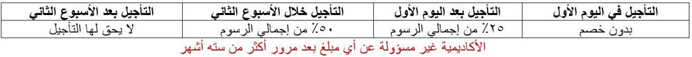 - في حال عدم حضور المتدربة في الأوقات المحددة من قبل الأكاديمية ( للإعادة ) يتم دفع رسوم وقدرها 200 ريال خلال ست أشهر .